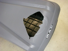 Nejhorší „rakev“ v testu, jak se střešním boxům v Česku často přezdívá, navíc nesnáší dobře mrazy. Plast MAC Daytony při teplotě minus 20 stupňů Celsia prasknul a vytvořila se v něm velká díra.
