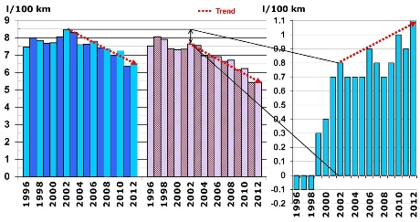 V roce 2002 se udávaná a skutečná spotřeba testovaných aut s objemem motoru nižším než dva litry v průměru zastavila na úrovni 7,65 a 8,47 litru na 100 km.